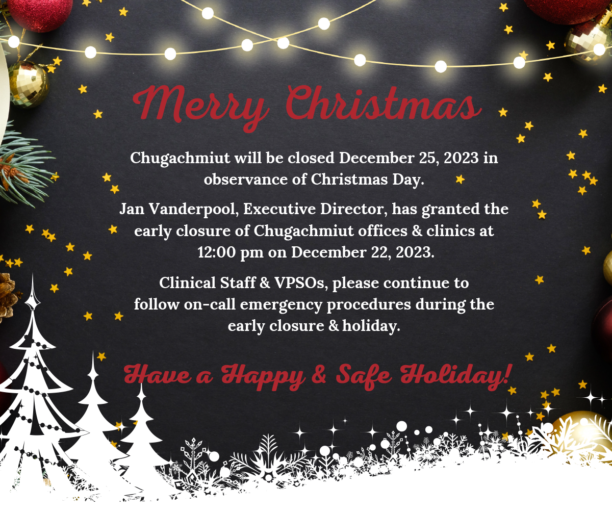 Chugachmiut will be closed on December 25, 2023 in observance of Christmas Day. We will resume regular business hours on Tuesday, December 26, 2023. Have a joyous and safe holiday!