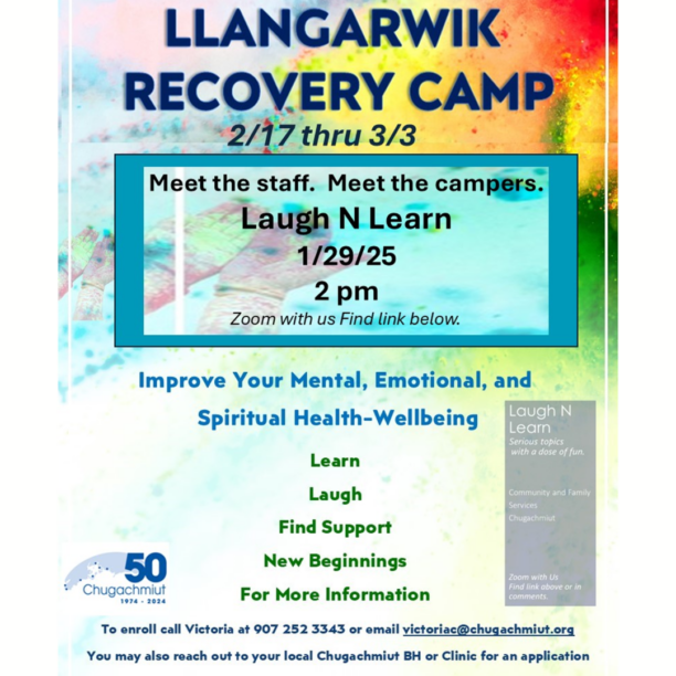 Cama’i! Join us for a virtual Laugh & Learn session on Wednesday, Jan. 29, at 2 p.m., featuring Llangarwik Recovery Camp with staff and campers.