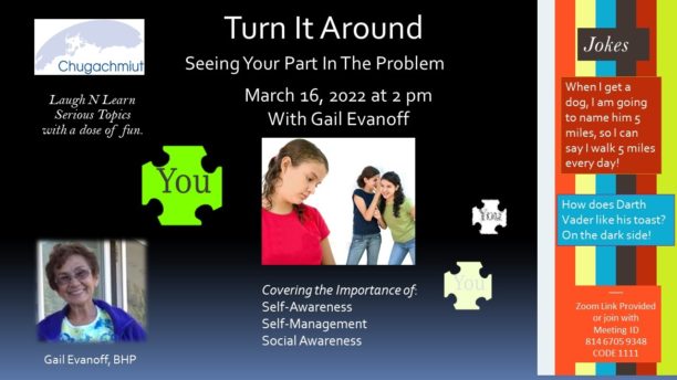 Gail Evanoff of Chenega will be presenting a program on how to change the problems in your life.