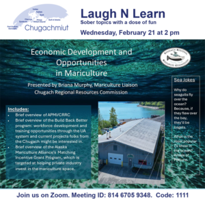 Cama’i! Join us for our virtual Laugh & Learn on Wednesday, February 21 at 2 pm. Learn about Economic Development and Opportunities in Mariculture with Breanne Murphy of Chugach Regional Resources Commission! Contact sandrak@chugachmiut.org for the Zoom link. Quyanaa/AwA’ahdah!
