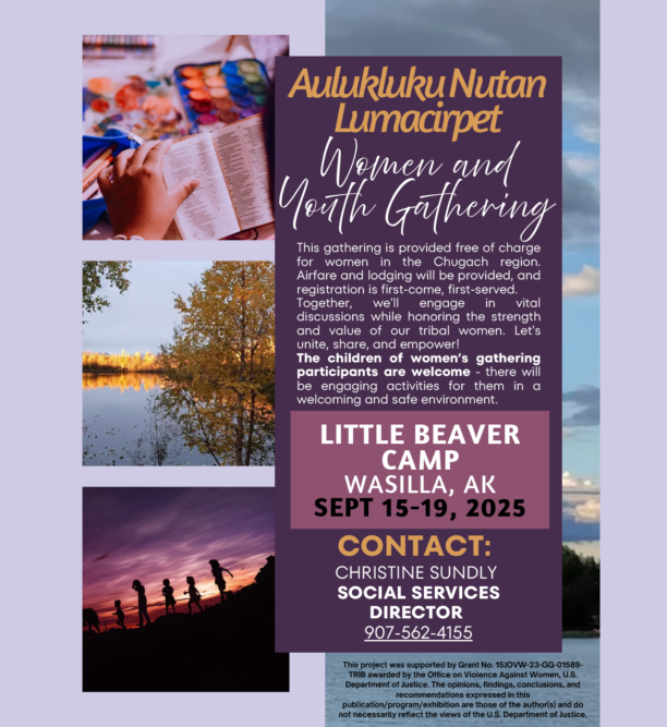 Cama’i! We’re hosting Aulukluku Nutan Lumacirpet – a free Women and Youth Gathering in Wasilla on September 15-19. Women and their children from the Chugach region are welcome, with airfare and lodging provided. Let’s come together to learn, share, and empower! Kids’ activities will be provided in a safe, welcoming space.