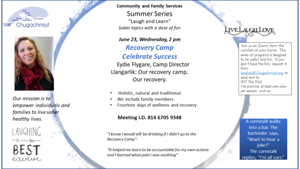 For more information, contact Eydie Flygare at 907-602-8644 or email EydieF@chugachmiut.org. To sign up download the Application: Recovery Camp Application